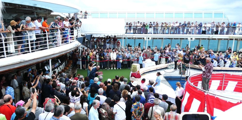 元旦の昼には鏡開きが行われて、日本酒が振る舞われます。着物や浴衣姿の日本人、外国人も多くいます。私も和服で参加して酒を1杯いただきました。 鏡開きの他にも、おせち料理に初釜もあって、赤道直下の洋上で非常に珍しい正月になりました。