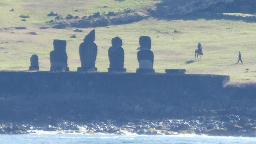 島に近づくと、船からモアイ像5体が確認できます。やはりこの島はモアイ像の島で、島内には約1000体ものモアイ像があると言われています。