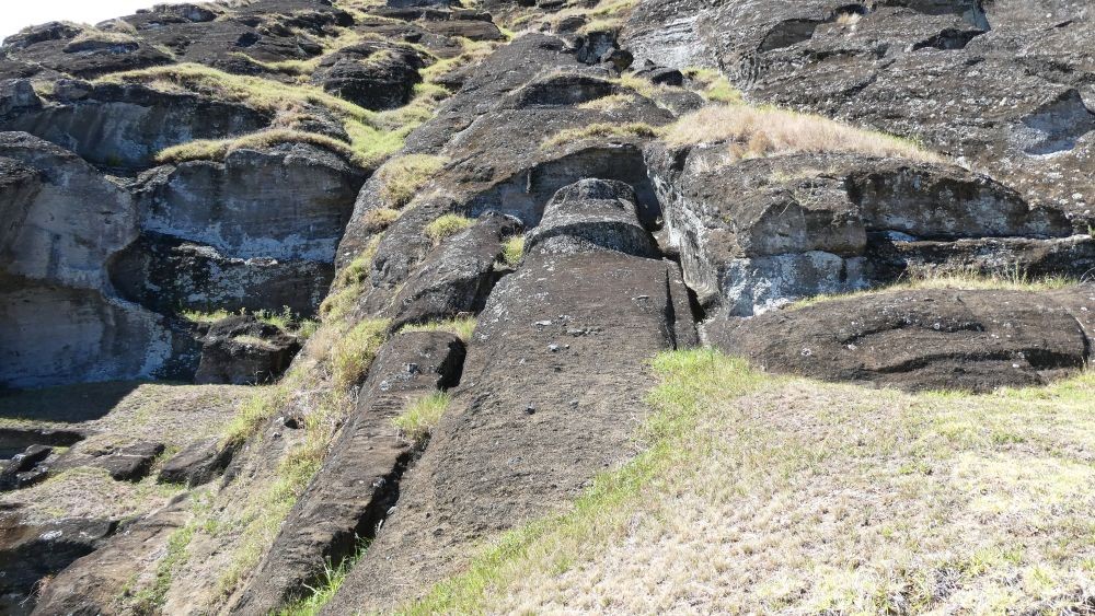 モアイ像切り出し場跡の「ラフ・ララク」には製造過程のモアイ像が多く見られます。中には最大で21.6mのものもあります。