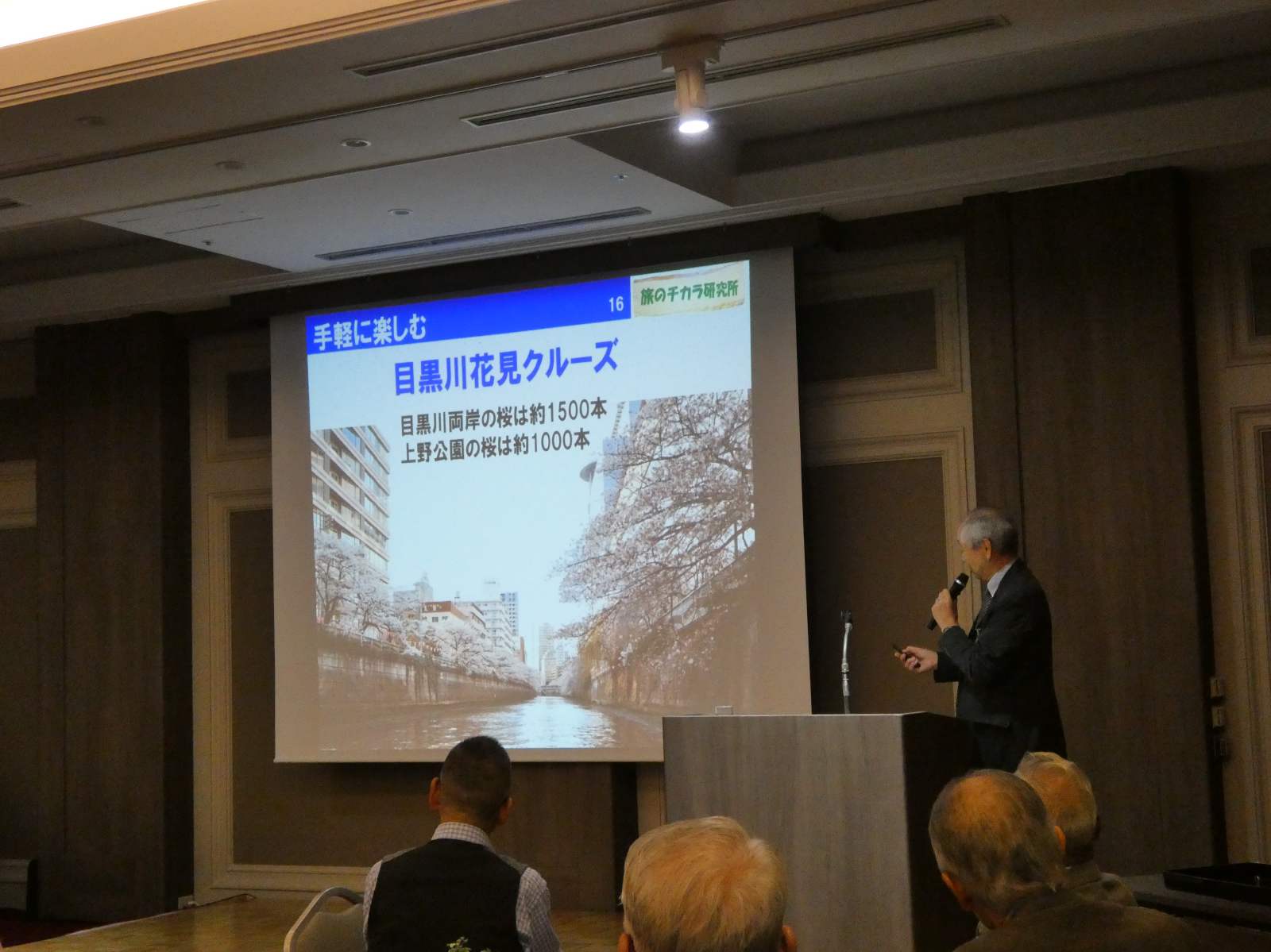 10分ほどの休憩の後、第2部の講演会「シニアの旅」と題して旅のチカラ研究所所長植木圭二さんの講演が行われました。 シニアにとって旅は『非日常を楽しむ』認知症予防にもつながります。また新たな楽しみ方、多角的な旅の視点を認識させられた講演でした。 その中で来年度の研修旅行の旅行先紹介、催し物、楽しみ方を紹介しました。
